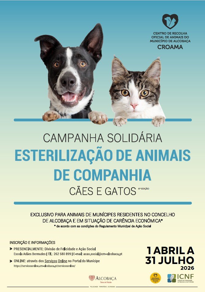 Irá decorrer no período de 1 de abril a 31 de julho 2026, a Campanha Solidária – “Esterilização de Animais de Companhia”, direcionada a munícipes do concelho de Alcobaça em